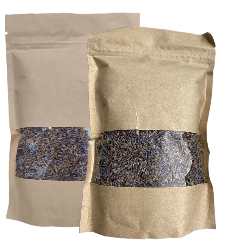 Лаванда поставляется в герметичном бумажном Zip-пакете, который обеспечивает удобство хранения и защищает продукт от влаги, сохраняя его свежесть и аромат надолго.