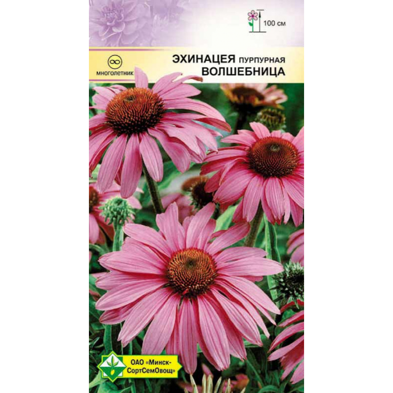 Уникальное лекарственное и декоративное многолетнее растение высотой до 1 м. Цветки крупные - в диаметре 9-11 см, пурпурно-розовые. Для срезки и групповых посадок. Ценность растения - способность повышать естественные защитные силы организма. В лекарственных целях используют стебли с соцветиями (в начале цветения) и корни (осенью). Семена высевают в грунт в конце апреля - начале мая. Предпочитает хорошо освещенное место и плодородную почву.Качество семян соответствует ГОСТу 12420-81 и Постановлению МСХП РБ от 29.10.2015г. №37.