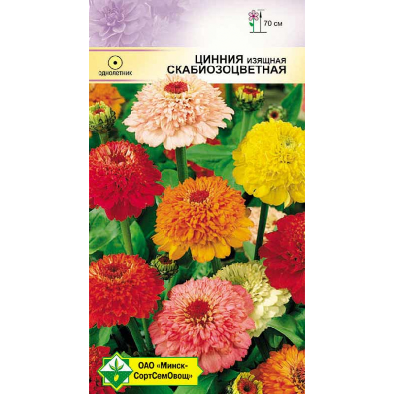 Смесь сортов. Красивое однолетнее растение высотой около 70 см. Соцветия полушаровидные, по строению похожие на скабиозу темно-пурпурную, махровые, различных окрасок, в диаметре 7-8 см. Цветет очень обильно. Рекомендуется для клумб и срезки в букеты. Выращивают посевом семян в грунт под пленку в мае или на рассаду с начала апреля. Рассаду высаживают в конце мая на солнечное место.Качество семян соответствует ГОСТу 12260-81 и Постановлению МСХП РБ от 29.10.2015г. №37.