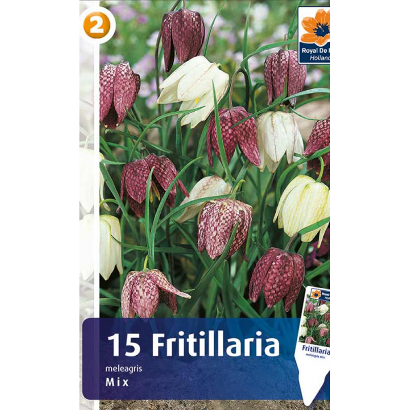 Фритиллярия Meleagris Mix - эффектный представитель фритиллярии (рябчика), с характерной шахматной окраской. Лепестки аккуратно расписаны в клеточку и очень похожи на шахматную доску. Цветки, как правило, поникшие, колокольчатые, до 4-5 см в длину. Цветоносы тонкие, гладкие или с бугорками. Листья линейно-ланцетные, серо-зеленого цвета.Высота растения - около 25 см. Цветет в апреле в течение 2-3 недель.Отлично подходит для оформления клумб в сочетании с другими цветущими многолетниками, а также как одиночное горшечное растение на балконах и лоджиях.