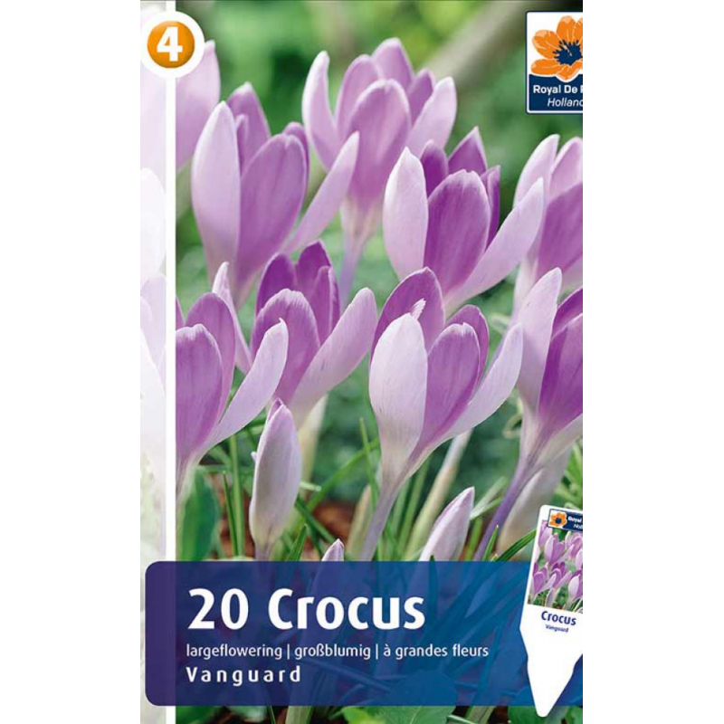 Крокусы Vanguard - эффектный сорт крупноцветковых крокусов, бело-фиолетовой окраски. Лепестки снаружи белые, а внутри – фиолетово-лиловые. Цветки бокаловидные, размером до 8 см, ароматные, аромат тонкий, приятный. Листья зеленые, тонкие и вытянутые, продолжают расти даже после увядания цветков. Высота растения - около 10 см. Цветет в марте-апреле в течение 10-20 дней.Подходят для высаживания на клумбах и бордюрах группами, для выращивания на каменистых горках. Крокусы неприхотливы, на одном месте могут расти 5-6 лет без пересадки, с каждым годом увеличивая обильно цветущий букет. Идеальны в качестве горшечного растения.