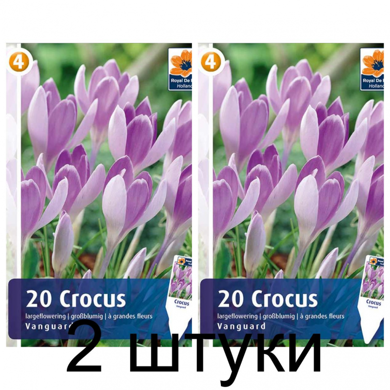 Крокусы Vanguard - эффектный сорт крупноцветковых крокусов, бело-фиолетовой окраски. Лепестки снаружи белые, а внутри – фиолетово-лиловые. Цветки бокаловидные, размером до 8 см, ароматные, аромат тонкий, приятный. Листья зеленые, тонкие и вытянутые, продолжают расти даже после увядания цветков. Высота растения - около 10 см. Цветет в марте-апреле в течение 10-20 дней.Подходят для высаживания на клумбах и бордюрах группами, для выращивания на каменистых горках. Крокусы неприхотливы, на одном месте могут расти 5-6 лет без пересадки, с каждым годом увеличивая обильно цветущий букет. Идеальны в качестве горшечного растения.
