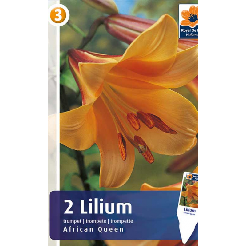 Лилия African Queen - шикарный сорт трубчатых лилий. Цветки абрикосово-оранжевого цвета, который снаружи немного сменяется на красно-коричневый. На одном стебле, как правило, размещается 5 цветков. Цветки шестилепестковые, крупные, до 16 см в диаметре. Листья зеленые.Высота растения - 120 см. Цветет в июне-августе.Сорт прекрасно подойдет для клумб, одиночных и групповых посадок, отлично соседствует с другими луковичными растениями, а также различными однолетними и многолетними культурами. Идеален для срезки, поскольку цветы долго сохраняют свежесть.