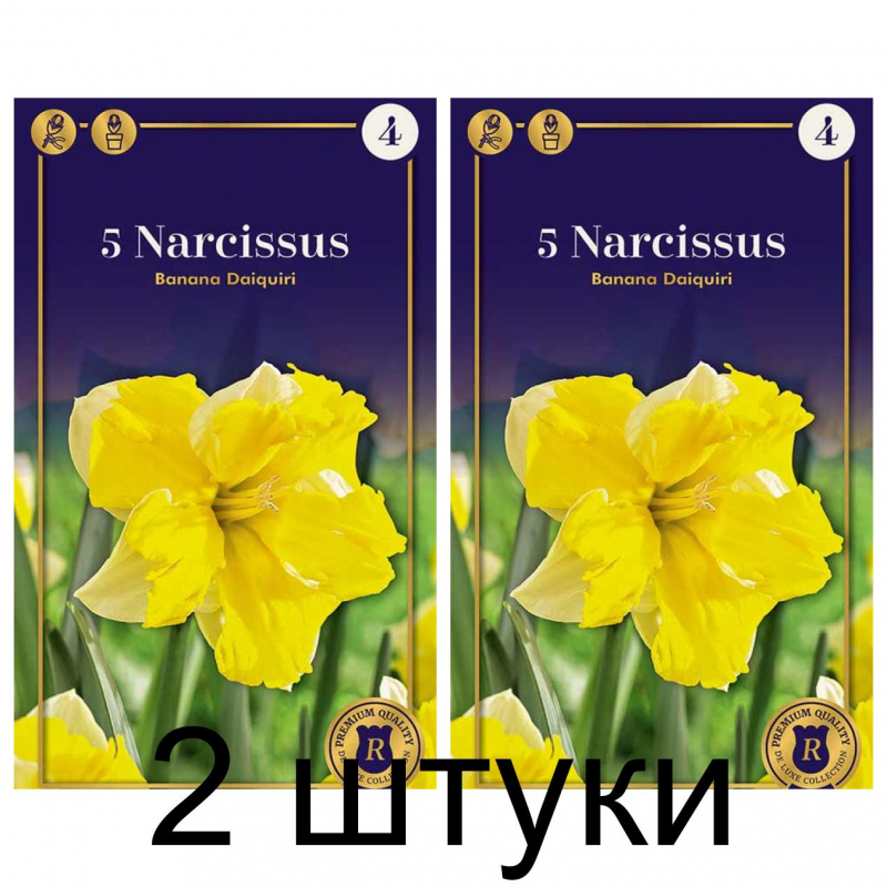 Нарциссы Banana Daiquiri - эффектный представитель нарциссов группы Сплит-корона бело-желтой окраски. Особенность нарциссов группы Сплит-корона - махровая разрезчатая коронка с отогнутыми краями. Нарцисс Banana Daiquiri имеет пастельно-белый околоцветник и бананово-желтую махровую коронку, почти перекрывающую околоцветник. Цветы крупные, в диаметре могут составлять до 10 см.Высота растения - около 40 см. Цветет в марте-апреле, цветение продолжительное и обильное.Сорт очень хорош для выращивания на срезку, для посадки в клумбах, цветниках и пейзажных посадках.