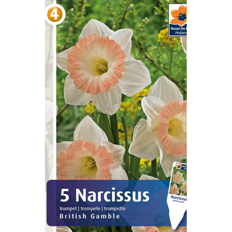 Нарциссы British Gamble - эффектный представитель трубчатых нарциссов. Лепестки фарфорово-белые с желтым оттенком у основания, коронка нежно-розового цвета с более яркой каймой по краю. Трубчатая коронка высокая, высотой 3-4 см. Диаметр цветка -12-15 см. Высота растения - около 40 см. Цветет в марте-апреле, продолжительность цветения - 2-3 недели.Сорт очень хорош для выращивания на срезку, для посадки в клумбах, цветниках и пейзажных посадках.