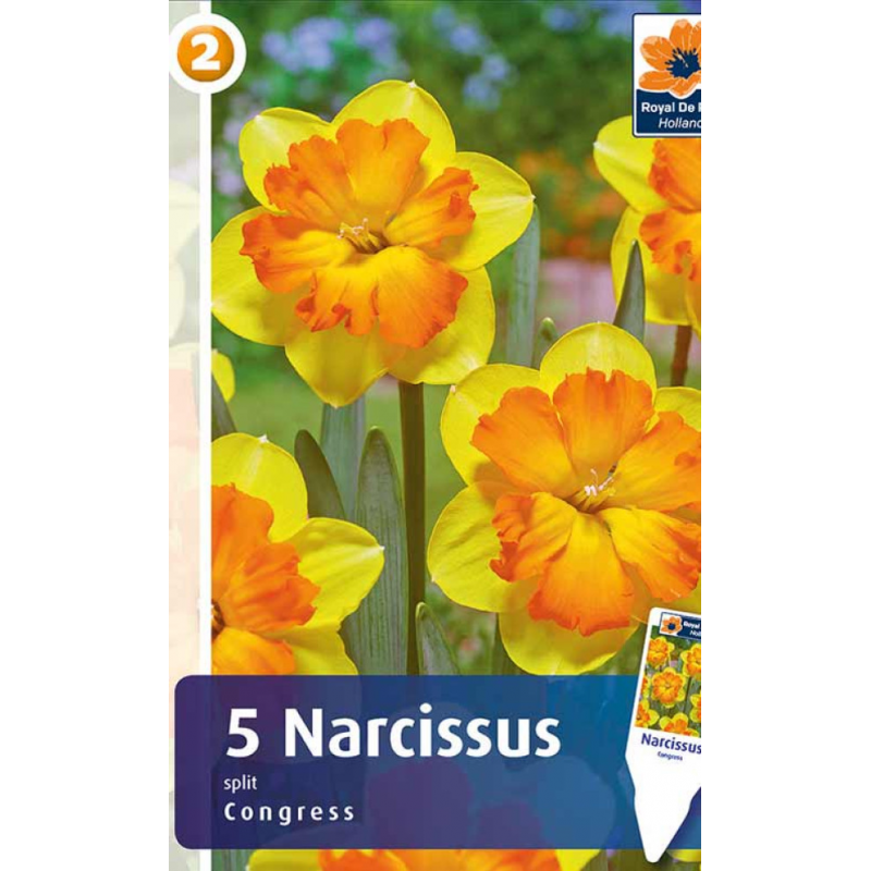 Нарциссы Congress - эффектный представитель нарциссов группы Сплит-корона, цветы которого напоминают орхидею. Особенность этой группы нарциссов - в том, что коронка разрезана более чем на 1/3 своей длины.Лепестки ярко-желтые, ровные и прямые, с крупной оранжевой коронкой, края которой неправильной формы, вьющиеся и воздушные. Коронка почти полностью перекрывает лепестки. Цветы крупные, в диаметре - до 10 см. Высота растения - около 45 см. Цветет в марте-апреле, продолжительность цветения - 2-4 недели.Сорт очень хорош для выращивания на срезку, для посадки в клумбах, цветниках и пейзажных посадках. Размножается отлично. Дает великолепную выгонку.
