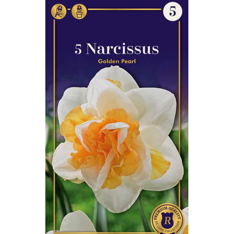 Нарциссы Golden Pearl - эффектный представитель махровых нарциссов бело-персиковой окраски. Несколько рядов бело-кремовых околоцветников в перемешку с пышными гофрированными фрагментами яркой абрикосовой коронки закручены в крупный красивый цветок диаметром 8 см. Разрезная коронка постепенно меняет окраску от золотисто-желтых оттенков до персиковых.Высота растения - около 25 см. Цветет в марте-апреле, цветение продолжительное - до 3-4 недель.Сорт очень хорош для выращивания на срезку, для посадки в клумбах, цветниках и пейзажных посадках.