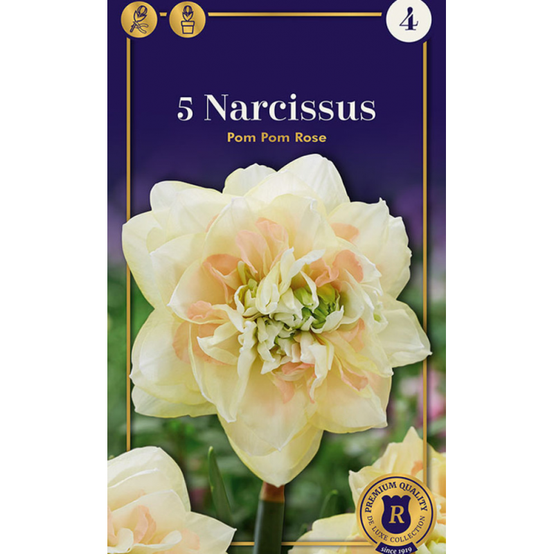 Нарциссы Pom Pom Rose от Royal De Ree Holland — это уникальный сорт с необычными и эффектными соцветиями. Их лепестки нежного кремового оттенка окружают роскошную махровую коронку с розово-оранжевыми тонами, придавая цветку изысканный и утонченный вид. Этот сорт станет настоящей жемчужиной вашего сада, привлекая внимание своей красотой и оригинальностью. Высококачественные луковицы из Нидерландов обеспечивают отличное цветение и долговечность. Нарциссы Pom Pom Rose идеально подходят для создания клумб, бордюров и декоративных композиций. Они также прекрасно смотрятся в срезке, добавляя шарм букетам и цветочным аранжировкам. Нарциссы неприхотливы в уходе, предпочитают солнечные места или легкую полутень с плодородной, хорошо дренированной почвой. Посадка осенью гарантирует раннее весеннее цветение, наполняя сад яркими красками и создавая атмосферу пробуждения природы.