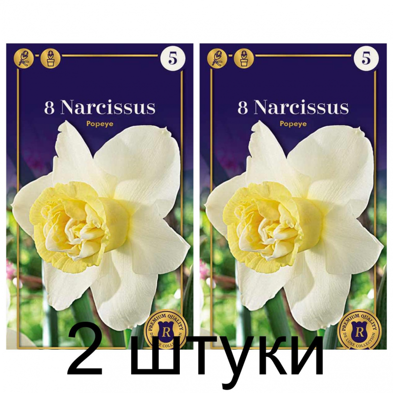 Нарциссы Popeye - эффектный сорт махровых нарциссов. Цветки необычной формы, с очень приятным и насыщенным ароматом, крупного размера, белого цвета с вытянутой желто-белой короной. Нижний ряд лепестков — белый, полностью раскрытый, с тонким жилкованием и приятными тактильными свойствами. Верхние лепестки, составляющие корону нарцисса, — желтые, объемные, вытянутые вверх в форме колокольчика, дополненные перьями-лепестками белого цвета. На одном цветоносе, как правило, расположен один цветок до 5-8 см в диаметре.Высота растения - около 40 см. Цветет в марте-апреле.Сорт очень хорош для выращивания на срезку, для посадки в клумбах, цветниках и пейзажных посадках.
