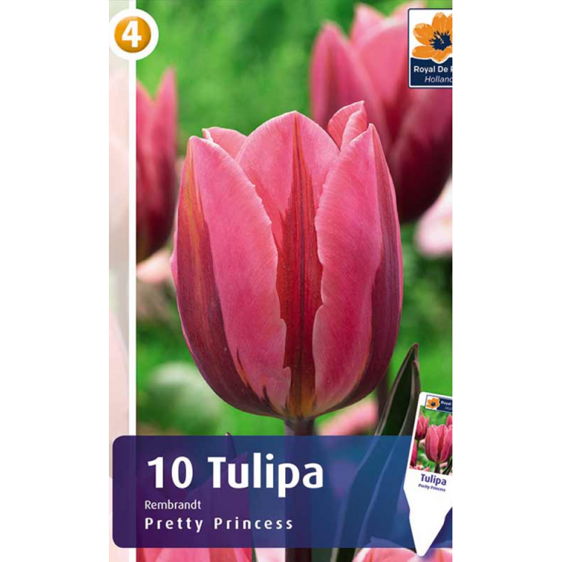 Тюльпаны Pretty Princess - эффектный сорт группы Рембрандт.Цветки бокаловидные, розово-красные с пурпурными отметинами и зелеными полосками, размером около 10 см.Высота растения - 35-40 см. Цветет в апреле-мае.Сорт подходит для озеленения и украшения клумб, а также для срезки и оформления букетов.