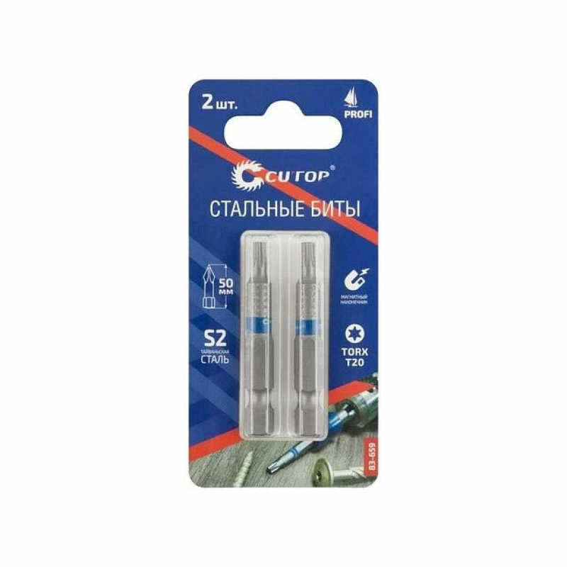 Биты стальные Profi 2 шт, TORX T20, 50 мм CUTOP 83-659 предназначены для работы с шуруповертами при монтаже/демонтаже крепежа. Ресурс биты от 2000 шт саморезов.
