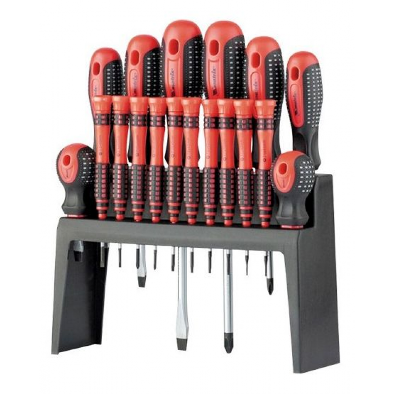 Рукоятки трехкомпонентные, что обеспечивает эргономичный захват и предотвращает скольжение даже при длительной работе. Прямая форма рукояток позволяет удобно распределять усилие, снижая нагрузку на руку. Набор также оснащён отвертками с намагниченными наконечниками, что облегчает работу с мелкими крепежами и повышает точность.