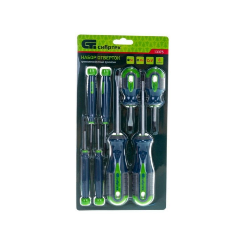 Универсальный набор отверток Сибртех 13375 включает 8 предметов из стали CrV с трехкомпонентными рукоятками, рассчитанных на бытовое использование. Отвертки предназначены для монтажа/демонтажа стандартных крепежных элементов и микровинтов с профилем SL и PH. Длина стержней 38-100 мм позволяет работать в узких пространствах и небольших углублениях.