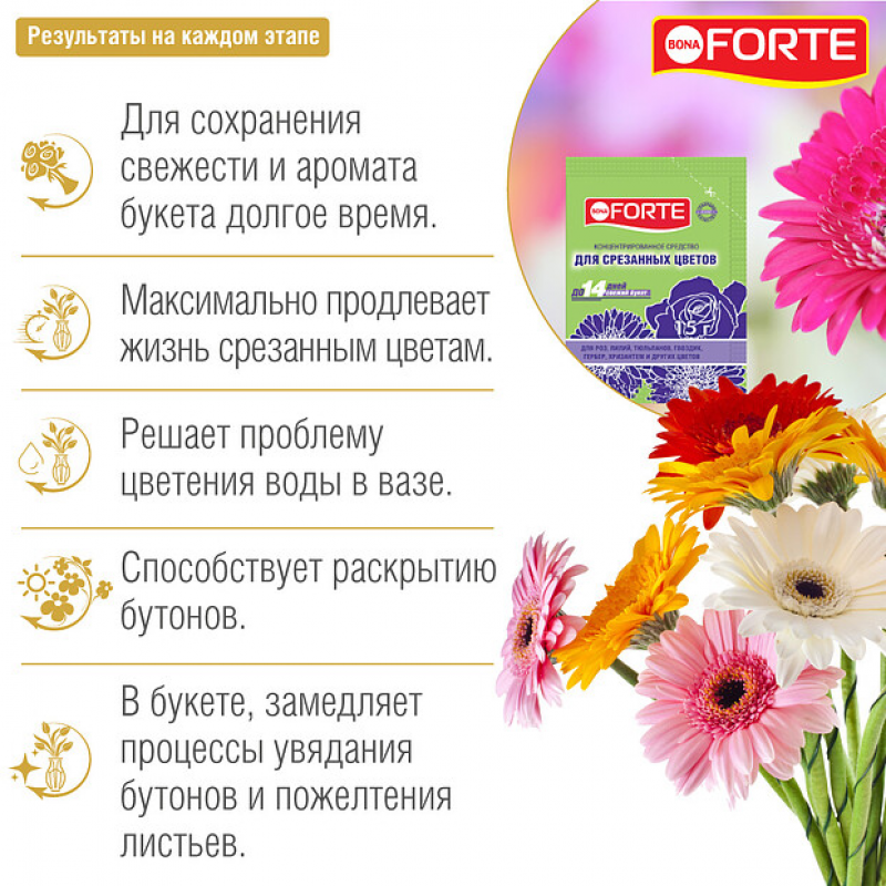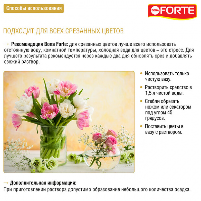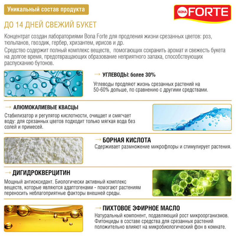 Средство для срезанных цветов BONA FORTE, концентрат, создан лабораториями Bona Forte для продления жизни срезанных цветов: роз, тюльпанов, гвоздик, гербер, хризантем, ирисов и др. Формула комплексного действия:Углеводы: более 30%, продляют жизнь срезанных растений на 50-60% дольше, по сравнению с другими средствами;Алюмокалиевые квасцы: стабилизатор и регулятор кислотности, очищает и смягчает воду: для срезанных цветов подходит только мягкая вода без солей и примесей;Борная кислота: сдерживает размножение микрофлоры и стимулирует растения. Применение: использовать только чистую вазу; растворить средство в 1,5 л чистой воды; стебли обрезать ножом или секатором под углом 45 градусов; поставить цветы в вазу с раствором. Дополнительная информация:При приготовлении раствора допустимо образование небольшого количества осадка. Рекомендация Bona Forte: для срезанных цветов лучше всего использовать отстоянную воду, комнатной температуры, холодная вода для цветов – это стресс. Для лучшего результата рекомендуется через каждые два дня обновлять срез и добавлять свежий раствор.