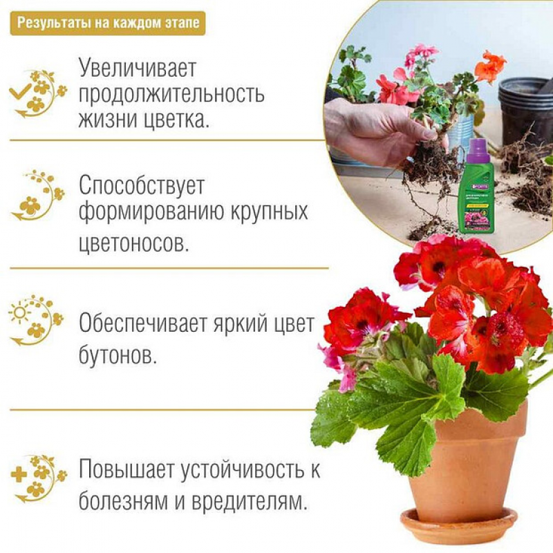 Форма выпуска в виде водного концентрата облегчает использование, позволяя точно дозировать средство. Препарат помогает растениям обильно цвести, сохраняя их здоровье и декоративный вид.