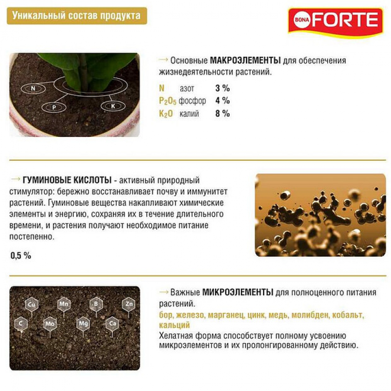 Состав дополнен гуматом (0,5%) и девятью микроэлементами, включая бор, железо, марганец, цинк, медь, молибден, кобальт, а также кальций и магний. Шесть микроэлементов представлены в хелатной форме, что обеспечивает их легкое усвоение растениями. Препарат восстанавливает почву, укрепляет иммунитет растений и способствует их устойчивости к неблагоприятным условиям.