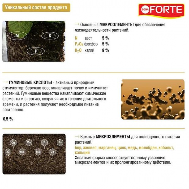 Также в состав входят гумат (0,5%) и девять микроэлементов, включая бор, железо, марганец, цинк, медь, молибден, кобальт, кальций и магний. Шесть из этих микроэлементов находятся в хелатной форме, что обеспечивает их эффективное усвоение растениями.
