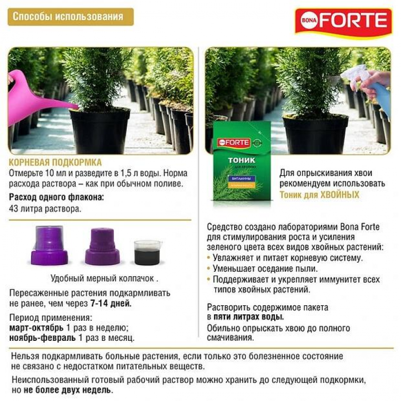 - Стимулирует рост и корнеобразование, предотвращает осыпание иголок и поддерживает яркий зеленый цвет хвои.