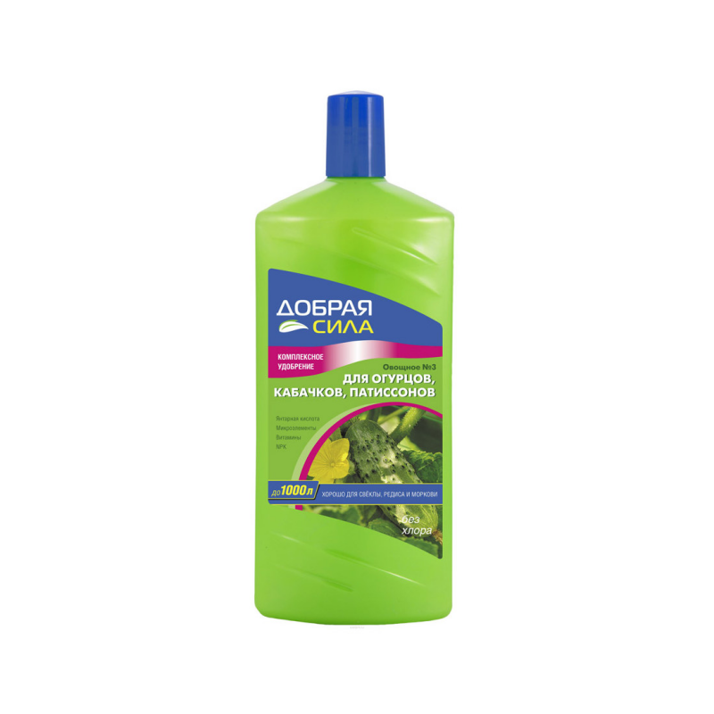Удобрение для огурцов, кабачков, патиссонов ДОБРАЯ СИЛА (1 л) — минеральное удобрение в виде водного концентрата, предназначенное для улучшения питания овощных культур, таких как огурцы, кабачки и патиссоны. Сбалансированное удобрение с тремя основными макроэлементами (азот, фосфор, калий) и комплексом микроэлементов и витаминов способствует повышению урожайности и улучшению здоровья растений.
