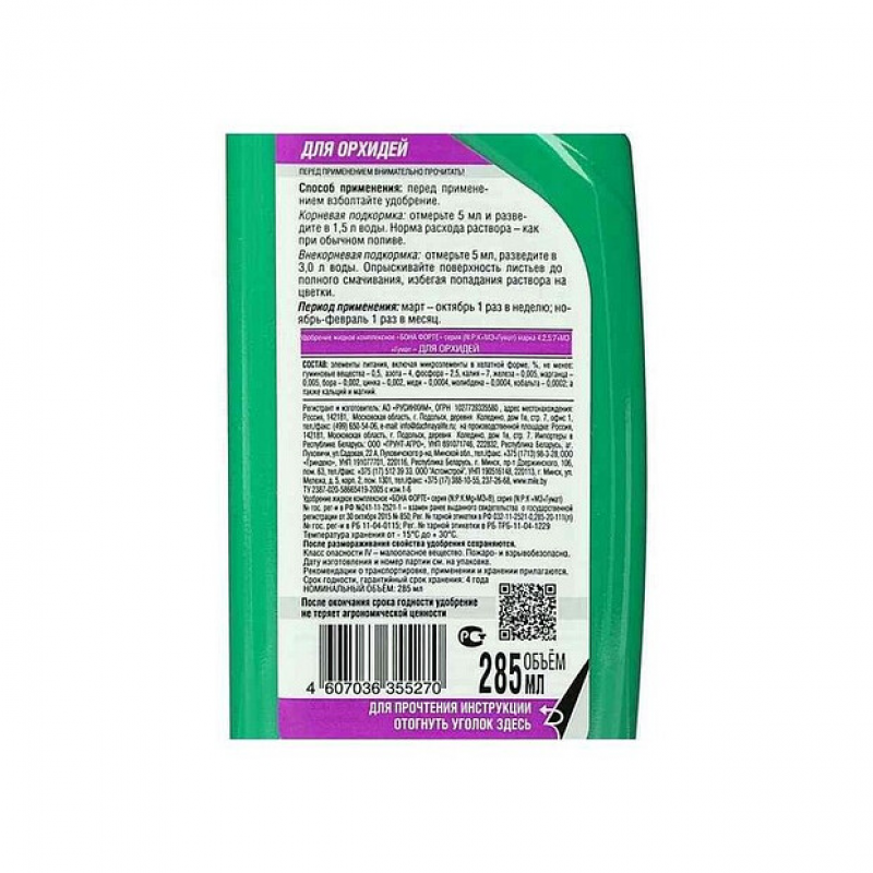 Объем упаковки 285 мл позволяет надолго обеспечить своих орхидей всем необходимым для их роста и цветения.