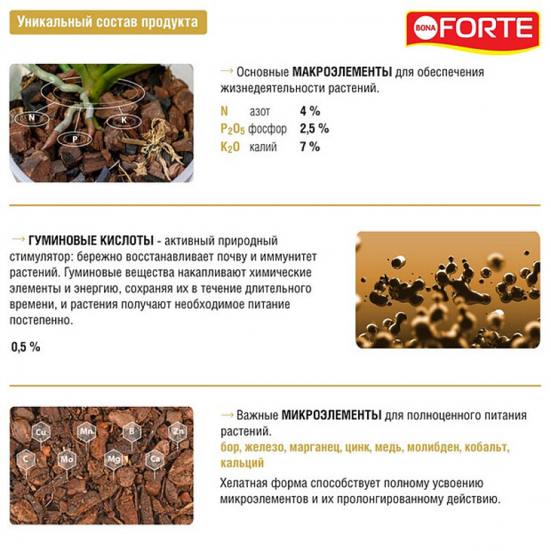 Удобрение для орхидей BONA FORTE ЗДОРОВЬЕ (285 мл) — минеральное удобрение для орхидей, стимулирующее их цветение и увеличивающее продолжительность цветения. Состав включает три основных макроэлемента: азот (N) — 4%, фосфор (P2O5) — 2,5%, калий (K2O) — 7%, а также гумат (0,5%) и девять микроэлементов, среди которых бор, железо, марганец, цинк, медь, молибден, кобальт, кальций и магний. Из них шесть микроэлементов представлены в хелатной форме для лучшей усвояемости растениями.