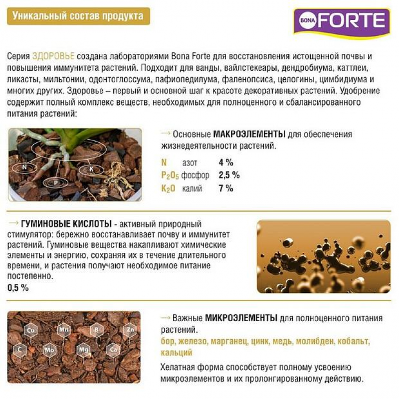 Удобрение для орхидей Bona Forte Здоровье органоминеральное (10 мл) — органоминеральное удобрение для орхидей в виде водного концентрата, предназначенное для стимулирования цветения и увеличения продолжительности цветения.