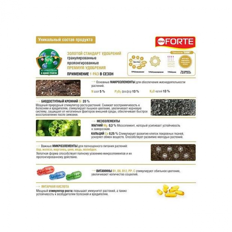 Удобрение для пионов и роз Bona Forte с биодоступным кремнием (1 л) — минеральное удобрение в гранулах, специально разработанное для цветущих растений, включая пионы и розы. Состав включает три основных макроэлемента (азот — 5%, фосфор — 13%, калий — 13%), биодоступный кремний (20%), магний (0,3%), кальций (0,25%) и шесть микроэлементов в хелатной форме (бор, железо, марганец, цинк, медь, молибден). Также присутствуют витамины (B1, B6, B12, PP, С) и стимулятор роста — янтарная кислота.