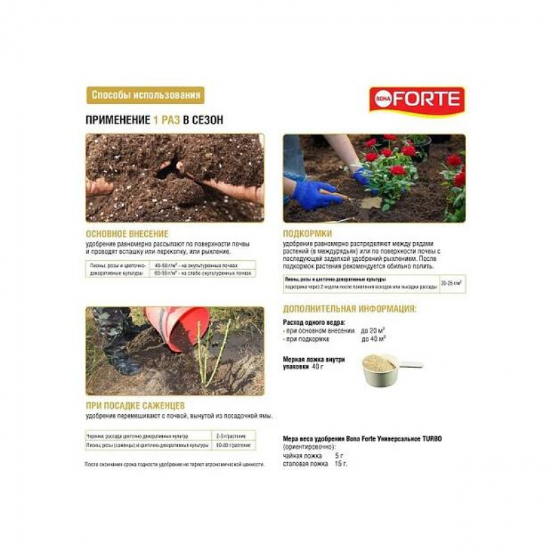Это удобрение стимулирует рост и цветение растений, а также повышает их устойчивость к болезням и вредителям. Идеально подходит для использования при основном внесении или подкормке, с покрытием площади 20-40 м².