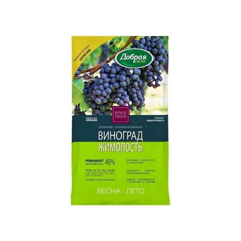 Удобрение Виноград-Жимолость ДОБРАЯ СИЛА весна-лето, гранулированное (0,9 кг) — минеральное удобрение, предназначенное для винограда и ягодных культур, таких как виноград и жимолость. Состав включает азот, фосфор, калий, кремний и цеолиты. Удобрение стимулирует рост растений, повышает их иммунитет и помогает переносить неблагоприятные внешние факторы, такие как перепады температуры.