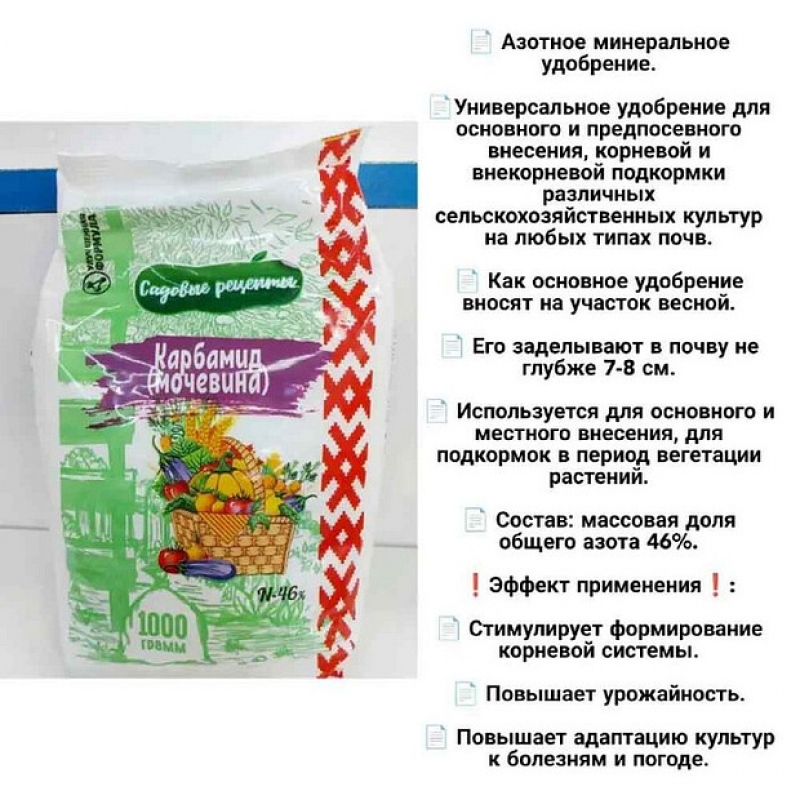 Карбамид или мочевина - это азотное минеральное универсальное удобрение (мочевина) для основного и предпосевного внесения, корневой и внекорневой подкормки различных сельскохозяйственных культур на любых типах почв. Как основное удобрение вносят на участок весной. Его заделывают в почву не глубже 7-8 см. Используется для основного и местного внесения, для подкормок в период вегетации растений. Применение: стимулирует формирование корневой системы; повышает урожайность; повышает адаптацию культур к болезням и погоде.