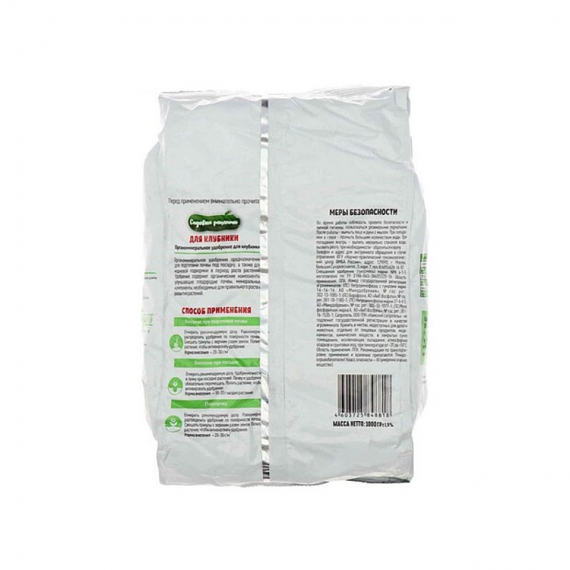 Органоминеральное удобрение для клубники, земляники - комплексное органоминеральное удобрение длительного действия с микроэлементами и гуматами для применения в защищенном и открытом грунтах в качестве основного удобрения при подготовке почвы для выращивания клубники. Оптимальное соотношение элементов питания предохраняет от избыточного накопления нитратов в продуктах; повышает морозоустойчивость и сопротивляемость растений болезням; рыхлость почвы и ее водопроницаемость; обеспечивает не только прирост урожая, но и улучшает питательную ценность продукции. Органоминеральная оболочка защищает растения от избыточного повышения солевой концентрации почвенного раствора в зоне развития корневой системы растений. Такие свойства делают это удобрение эффективным, в том числе, и стартовым удобрением для многих культур. Смешанное удобрение (тукосмесь) марки NPK 6-5-5.