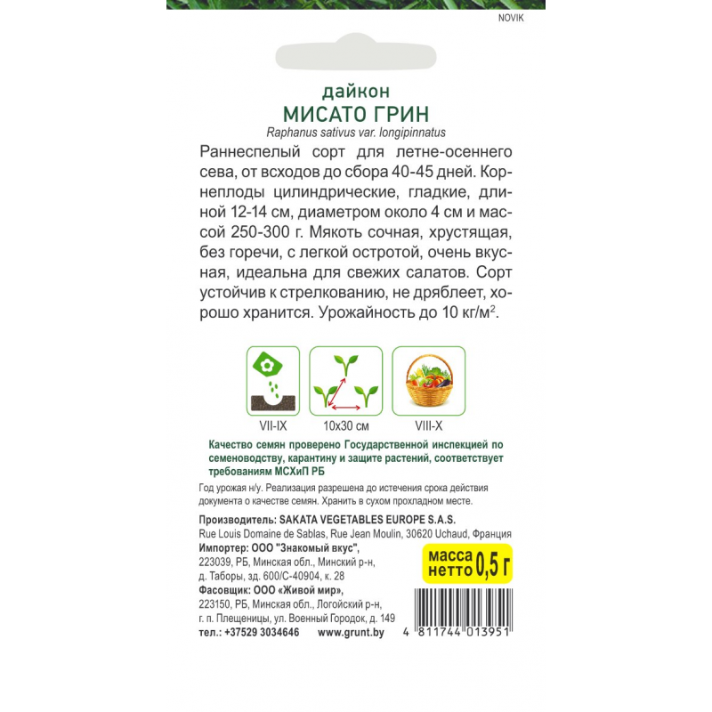 Раннеспелый сорт для летне-осеннего сева, от всходов до сбора 40-45 дней.