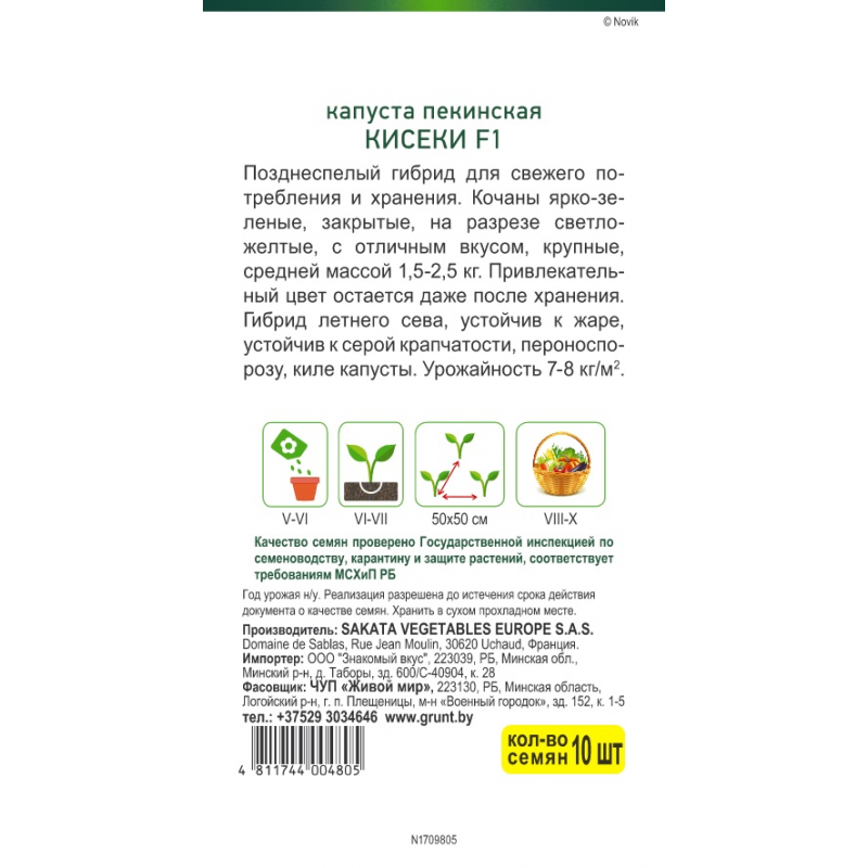 Гибрид летнего сева, устойчив к жаре, устойчив к серой крапчатости, пероноспорозу, киле капусты. Урожайность 7-8 кг/м.кв.