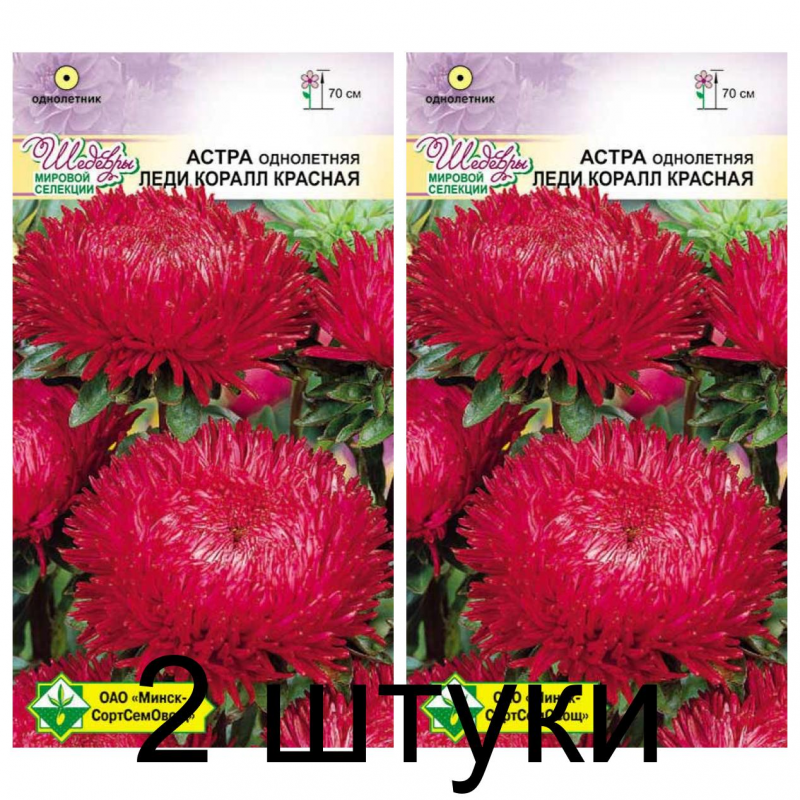 Новейший роскошный крупноцветковый сорт. Среднего срока цветения. Куст пирамидальный, прочный, высотой до 70 см. Цветет обильно и долго. Одно растение дает 8-12 стеблей для срезки. Завораживает красота густомахровых хризантемовидных соцветий ярко-красного цвета диаметром 10-12 см. Твердые длинные стебли, изящные соцветия и превосходная их сохранность делают эти астры непревзойденными для срезки и клумб.Качество семян соответствует ГОСТу 12260-81 и Постановлению МСХП РБ от 29.10.2015г. №37.