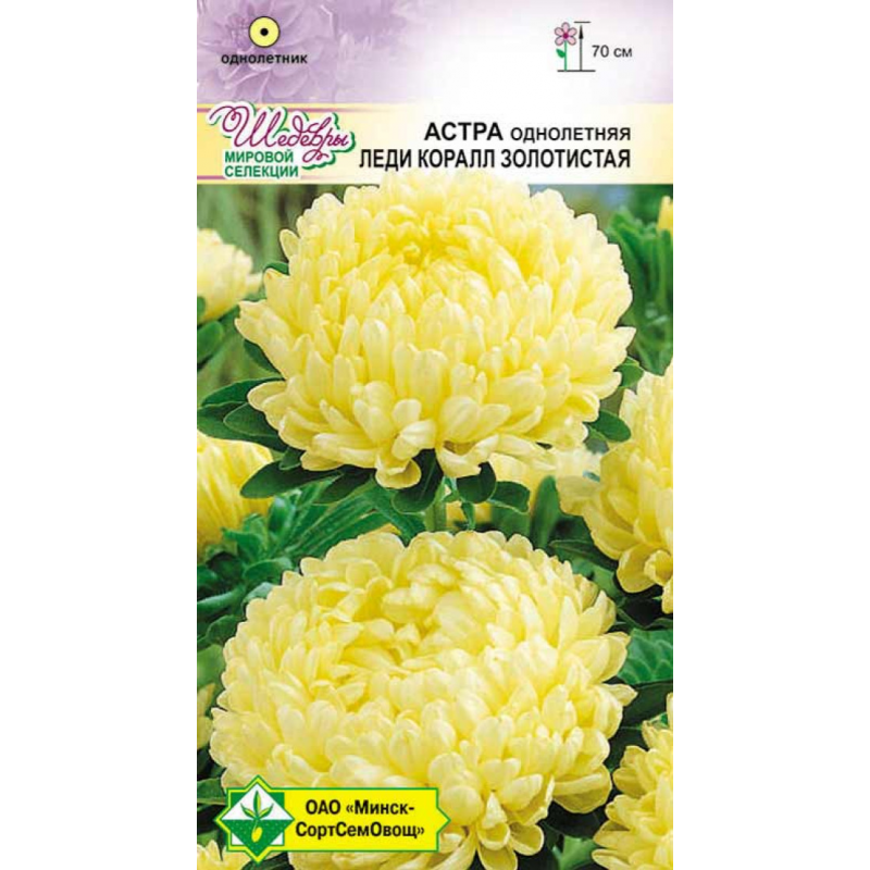 Новейший роскошный крупноцветковый сорт. Среднего срока цветения. Куст пирамидальный, прочный, высотой до 70 см. Цветет обильно и долго. Одно растение дает 8-12 стеблей для срезки. Завораживает красота густомахровых хризантемовидных соцветий золотисто-желтого цвета, диаметром 10-12 см. Твердые длинные стебли, изящные соцветия и превосходная их сохранность делают эти астры непревзойденными для срезки и оформления клумб.Качество семян соответствует ГОСТу 12260-81 и Постановлению МСХП РБ от 29.10.2015г. №37.