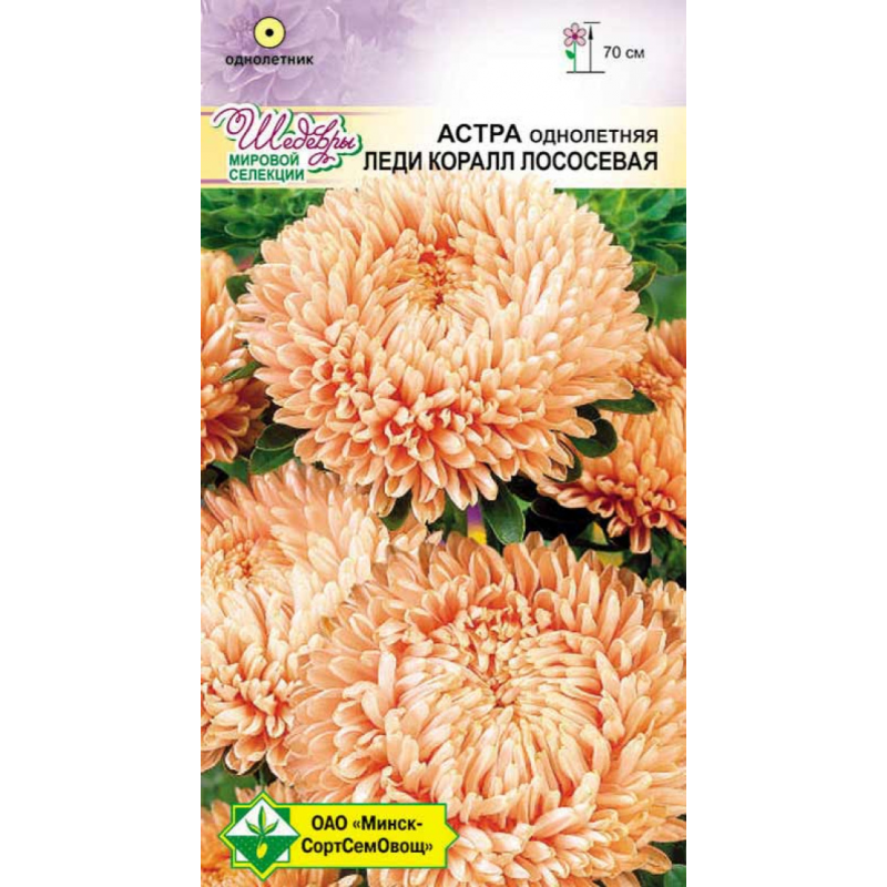 Новейший роскошный крупноцветковый сорт. Среднего срока цветения. Куст пирамидальный, прочный, высотой до 70 см. Цветет обильно и долго. Одно растение дает 8-12 стеблей для срезки. Завораживает красота густомахровых хризантемовидных соцветий лососевого цвета диаметром 10-12 см. Твердые длинные стебли, изящные соцветия и превосходная их сохранность делают эти астры непревзойденными для срезки и клумб.Качество семян соответствует ГОСТу 12260-81 и Постановлению МСХП РБ от 29.10.2015г. №37.