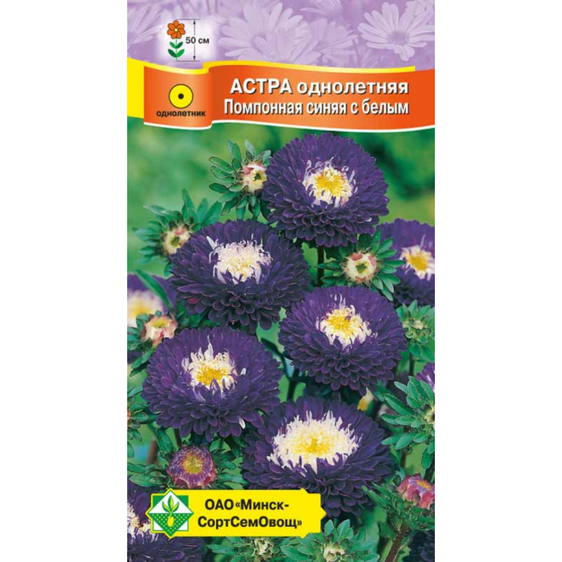 Великолепный декоративный сорт. Среднераннего срока цветения. Куст прочный, колонновидный, высотой около 50 см. Соцветия густомахровые, полусферические, сине-фиолетовые с белой серединой, в диаметре 5-6 см, непоникающие. На кусте до 30 цветущих соцветий. Используется для клумб и срезки. Посев на рассаду производят с конца марта до середины апреля. В открытый грунт рассаду высаживают в мае на солнечное место.Качество семян соответствует ГОСТу 12260-81 и Постановлению МСХП РБ от 29.10.2015г. №37.