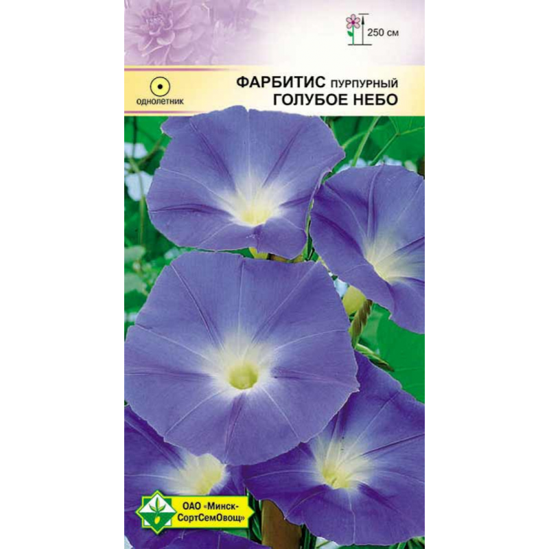 Однолетнее вьющееся растение высотой до 2,5 м. Одна из красивейших садовых лиан. Цветки воронковидные, небесно-голубого цвета, в диаметре 6-7 см. Цветение обильное и длительное. Идеально подходит для любого вертикального озеленения. Семена высевают в открытый грунт в конце апреля-мае. Пересаживают только с комом земли. Предпочитает рыхлую питательную почву и защищенное от ветра солнечное место.Качество семян соответствует ГОСТу 12260-81 и Постановлению МСХП РБ от 29.10.2015г. №37.