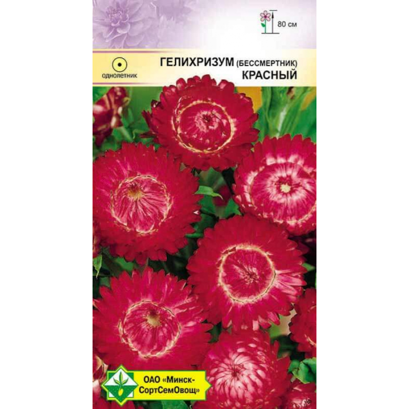 Однолетнее растение высотой до 80 см. Один из самых популярных среди сухоцветов. Соцветия-корзинки ярко-красного цвета, крупноцветковые (в диаметре 5-7 см), послужат украшением любой зимней композиции и букета. Срезают растения с полураспустившимися соцветиями и сушат в подвешенном состоянии в тени. Выращивают посевом семян непосредственно в грунт в конце апреля - начале мая или на рассаду в начале апреля.Качество семян соответствует ГОСТу 12260-81 и Постановлению МСХП РБ от 29.10.2015г. №37.
