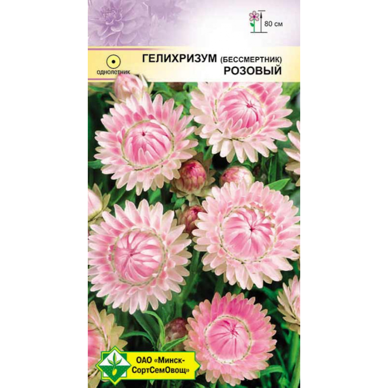 Однолетнее растение высотой до 80 см. Один из самых популярных среди сухоцветов. Соцветия-корзинки розового цвета, крупноцветковые (в диаметре 5-7 см), послужат украшением любой зимней композиции и букета. Срезают растения с полураспустившимися соцветиями и сушат в подвешенном состоянии в тени. Выращивают посевом семян непосредственно в грунт в конце апреля - начале мая или на рассаду в начале апреля.Качество семян соответствует ГОСТу 12260-81 и Постановлению МСХП РБ от 29.10.2015г. №37.