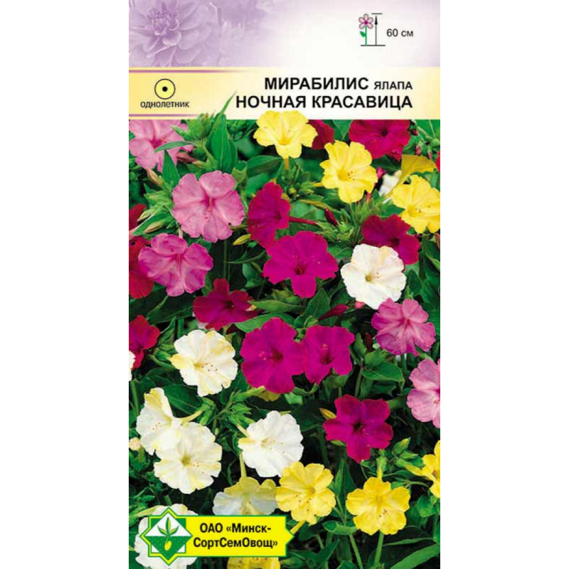Смесь колеров. Привлекательное однолетнее растение высотой до 60 см. Цветки воронковидные, белой, желтой, малиновой, пурпурной окраски, в диаметре 5-6 см, с приятным ароматом, открываются с вечера до утра и в пасмурную погоду. Прекрасно подходит для групповых посадок на газоне, клумб, рабаток, однолетних живых изгородей. Растение солнцелюбивое. Предпочитает произвесткованные суглинистые почвы.Качество семян соответствует ГОСТу 12260-81 и Постановлению МСХП РБ от 29.10.2015г. №37.