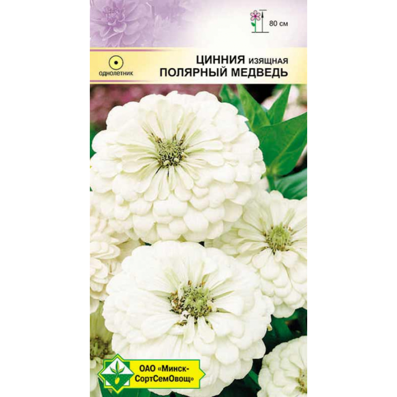 Привлекательное однолетнее растение высотой до 80 см. Соцветия-корзинки махровые, белые с легким зеленоватым оттенком, в диаметре 11-14 см, на длинном цветоносе. Сильные стебли не нуждаются в подвязке. Превосходный цветок для срезки. В букетах сохраняется 6-7 дней. Выращивают посевом семян в грунт под пленку в мае или на рассаду с начала апреля. Рассаду высаживают в конце мая на солнечное место.Качество семян соответствует ГОСТу 12260-81 и Постановлению МСХП РБ от 29.10.2015г. №37.