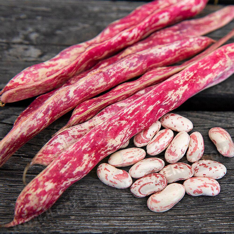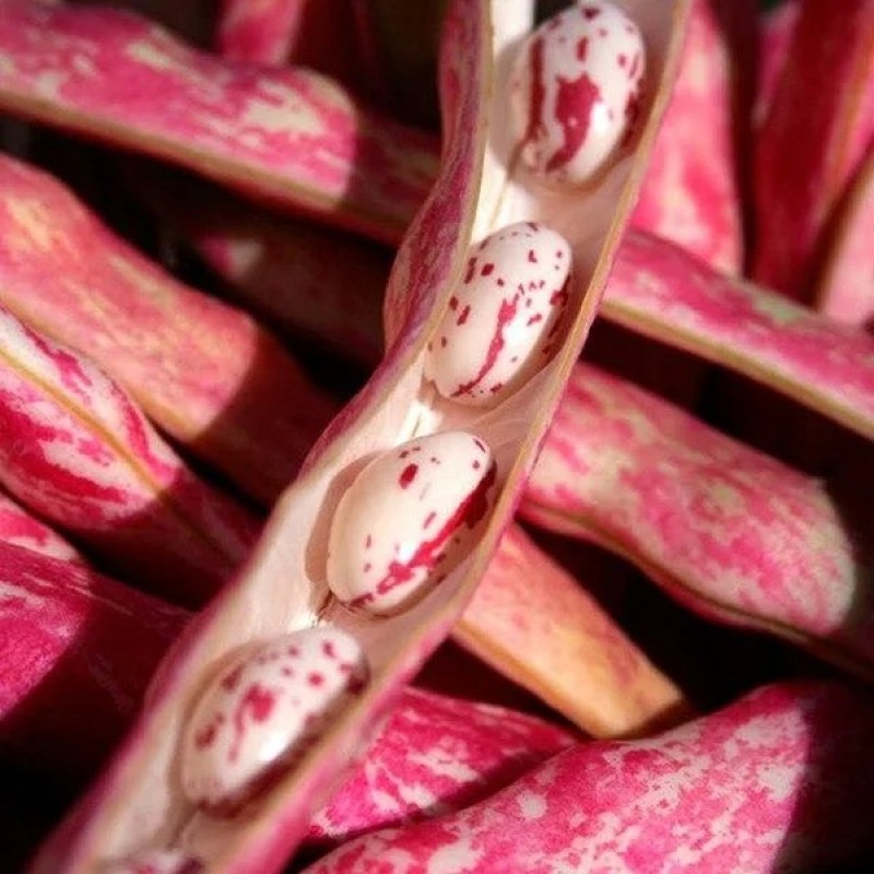 Характерная особенность: длинная лиана до 3м, длинные (15-20 см) изогнутые стручки. На стадии технической спелости стручки имеют желто-зеленый цвет с яркими красными или малиновыми разводами, напоминающими языки пламени. Зерна: крупные, вытянутые, почковидной формы, белые или кремовые с характерными малиново-красными или бордовыми пятнами и вкраплениями. При термической обработке (варке) цвет зерен или стручка может немного бледнеть или исчезать.