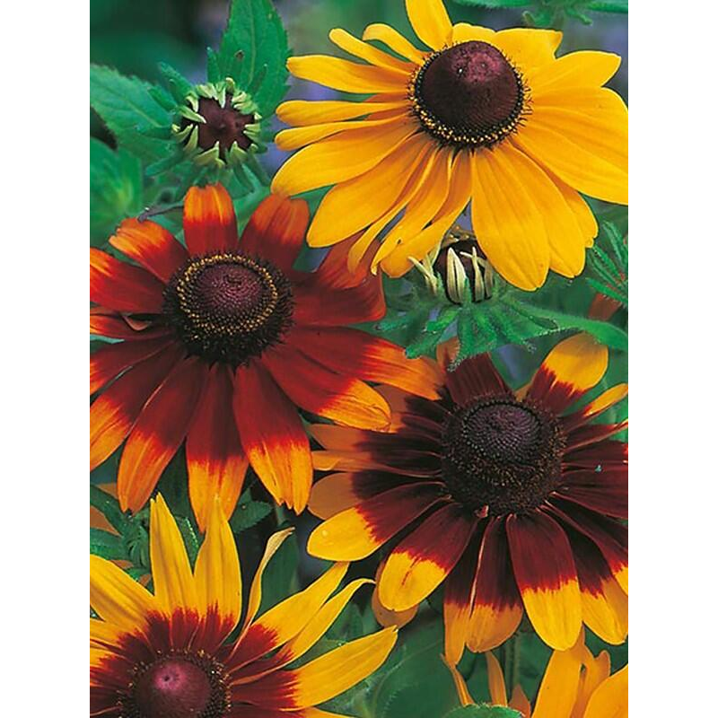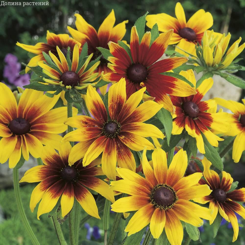 Побеги высотой 70-90 см опушенные, с крупными прикорневыми листьями. Даже после того, как отцветут крупные, 8-10 см в диаметре, однотонные или пестрые (от ярко-жёлтой до темно-рубиновой окраски) цветки, растение не теряет своей привлекательности. Особый шарм в этот период ему придают выпуклые цветоложа, еще долго возвышающиеся над растениями в осеннем саду. Рудбекия незаменима для групповых посадок на клумбах и в миксбордерах, а в садовых вазах она превращается в яркий неувядающий букет.