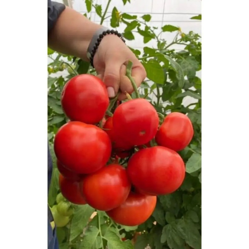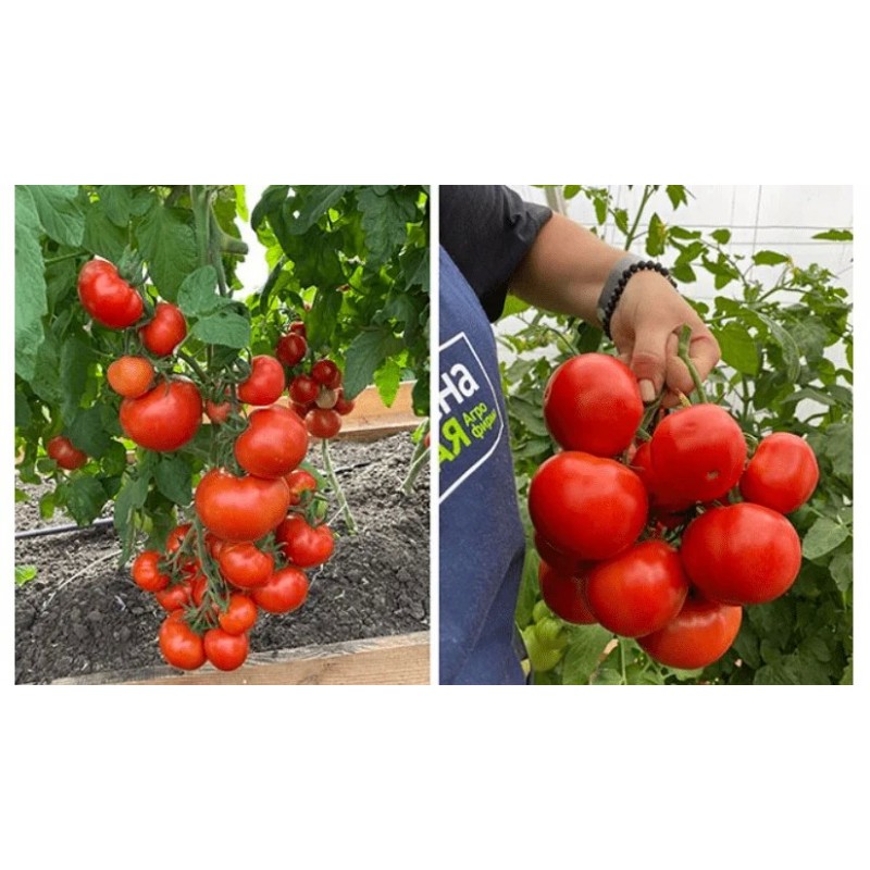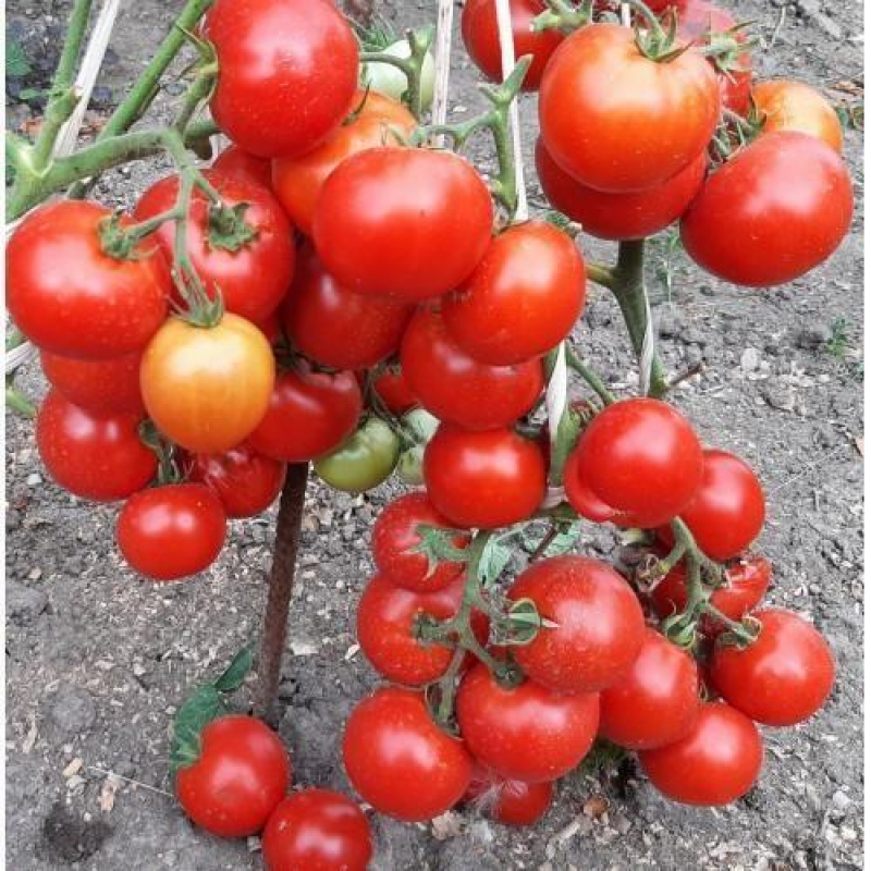 Среднеранний (100-105 дней) сорт для открытого и защищенного грунта. Растение детерминантное, высотой 1-1,2 м в открытом грунте и до 1,5 м в теплице, прекращает свой рост после формирования 6 плодовых кистей. Плоды насыщенно-красные, глянцевые, округлые, слегка уплощенные, массой 120-170 г, отдельные плоды могут достигать 350 г. Мякоть обладает ярким ароматом и гармоничным сладким вкусом с кислинкой. Плоды формируются в неправильных кистях массой до 2,5 кг; созревание дружное, за сезон с растения можно получить до 15 кг плодов! Сорт не требует формирования, хорошо устойчив к ряду заболеваний, в том числе фитофторозу, подходит для выращивания как в северных, так и в южных регионах.