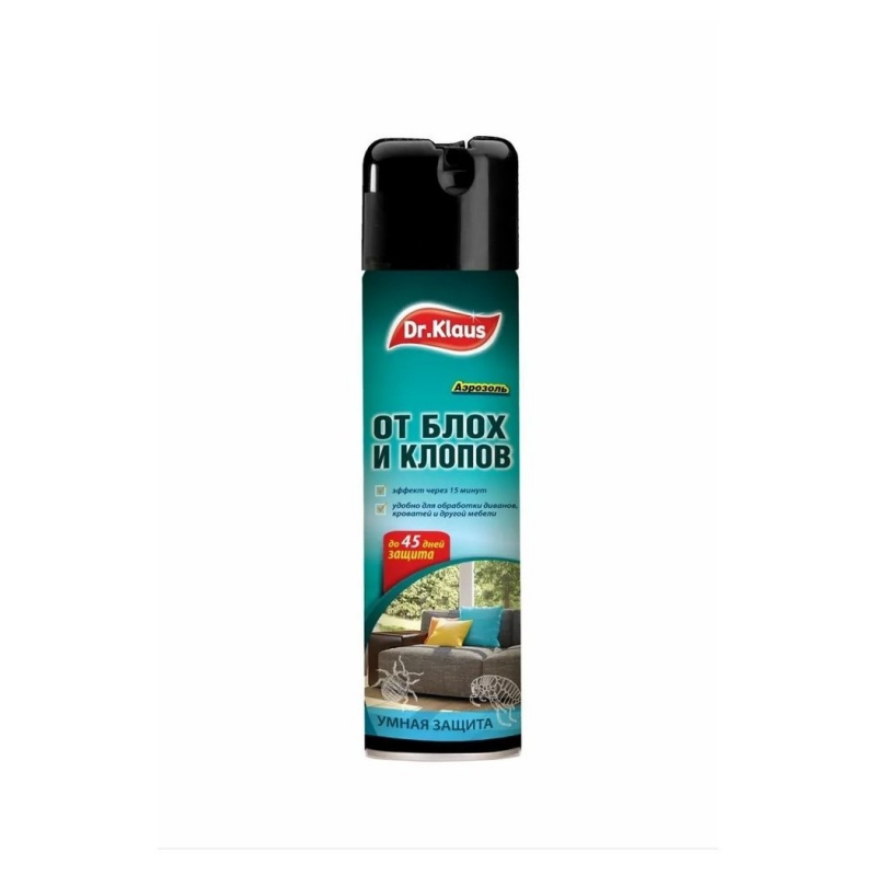 Аэрозоль от клопов и блох Dr. Klaus эффективен против постельных клопов, блох, кожеедов и других ползающих насекомых. Быстро сохнет - удобно для обработки кроватей, диванов и другой мебели. Эффект виден уже через 15 минут. Без запаха. Одного флакона достаточно для обработки поверхности до 13 м2. Длительная защита до 45 дней. Температура хранения от -20 С до +40 С. Срок годности 3 года.