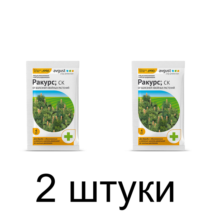 Фунгицид Ракурс 4мл avgust - (лекарство для борьбы с грибковыми заболеваниями хвойных растений) Ракурс на основе эпоксиконазола и ципроконазола (240 г/л + 160 г/л, суспензионный концентрат) эффективно борется с такими напастями как: шютте (снежное, обыкновенное) и ржавчина. Препарат быстро проникает в ткани растения, уже через два часа после опрыскивания устойчив к смыву дождем. Действует системно, распространяясь по всему дереву - от верхушки до прикорневого основания, и помимо лечебного действия обладает сильным профилактическим эффектом, уничтожая и препятствуя появлению спор возбудителей болезней. Рабочая жидкость из препарата готовится по схеме: 4 мл концентрата на 5 литров воды. Нормы расхода рабочей жидкости - от 2 до 5 литров на дерево в зависимости от густоты кроны и возраста. Опрыскивание производят при установлении устойчивых температур выше +5 (от шютте) и выше +10 (от ржавчины). Преимущества:Быстро проникает в ткани растения и не смывается дождем уже через 2 часа после опрыскивания. Имеет выраженное профилактическое и лечащее действие. Обладает искореняющим действием, препятствуя появлению спор возбудителей. Благодаря сильным системным свойствам распределяется во всех вегетирующих частях растения (от основания до верхушки).