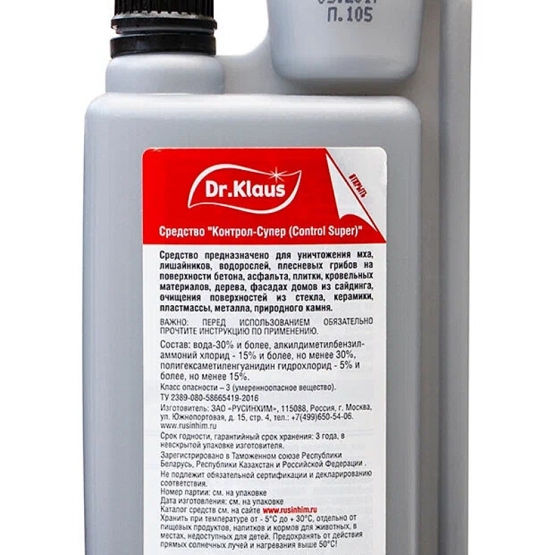 Средство от мха DR. KLAUS 250 мл (DK07310011) - концентрированное средство от плесени и мха, эффективно против мха, плесени, лишайников, водорослей. Защищает от повторного появления споровых растений. Благодаря уникальной мерной емкости легко рассчитать необходимое количество средства. Просто открутите колпачок, слегка надавите и удерживайте флакон концентрата до заполнения нужной шкалы верхней емкости. Возможно применение на стенах, окнах, кровле, плитке, дорожках, фонтанах и скульптурах, а также на поверхностях из стекла, керамики, пластмассы, металла, камня. Экономичный расход. Благодаря уникальной мерной емкости легко рассчитать необходимое количество средства. Просто открутите колпачок, слегка надавите и удерживайте флакон концентрата Dr. Klaus до заполнения нужной шкалы верхней емкости. Обязательно используйте средства защиты: закройте все участки тела, руки, лицо. Приготовьте рабочий раствор в зависимости от степени загрязнения (минимум 20 мл средства на 1 литр воды). Используйте любой триггерный распылитель. Обработайте полученным раствором загрязненную поверхность до смачивания (примерно 100-200 мл на 1 м2). Через 3-4 часа проведите механическое удаление растительности с помощью щетки. Через неделю повторите обработку. Не допускайте выхода людей и животных к обработанным поверхностям в течение 3 часов.