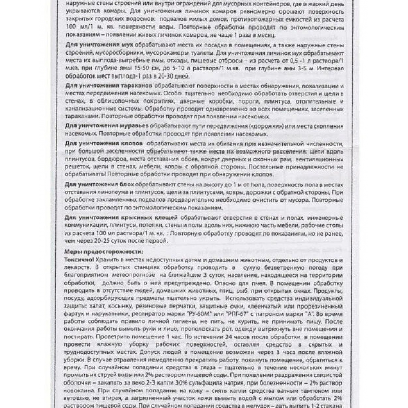 Средство от всех насекомых универсальный - профессиональное инсектицидное средство в форме концентрата, адаптированное для бытового применения. Предназначено для уничтожения тараканов, клопов, мух, блох, муравьев, комаров, крысиных клещей, а также лесных и таежных клещей – переносчиков возбудителей клещевого энцефалита и клещевого боррелиоза. Представляет из себя желтоватую полупрозрачную жидкость, которую перед применением необходимо развести водой согласно инструкции. Концентрат предназначен для обработки придомовой территории, также возможно применение внутри помещения. Способ использования: для проведения обработки необходимо приготовить рабочий раствор, добавляя средство к воде комнатной температуры в соотношении, определенном инструкцией, после чего провести обработку полученным раствором мест скопления и передвижения насекомых орошением из любой распылительной аппаратуры. Преимущества: Средство широкого спектра действия. Одной упаковки хватит для обработки до 10 соток. Профессиональное средство защиты - 100% результат. Удобство в применении. Остаточное действие (защита на 42 дня).