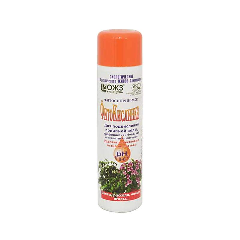 Для подкисления поливной воды, профилактики болезней и недостатка питания. Удаляет известковые пятна на листьях. К флакону прикреплены индикаторные полоски и инструкция. На флакон нанесена шкала кислотности (pH). Содержит: природные фитобактерии Bacillus subtilis 26Д; азот, фосфор, калий 1:3:1. Полив и опрыскивание растений подкисленной водой обеспечит оптимальный рост и развитие растений, профилактику болезней и недостатка питания, избавит листья от известковых пятен. Как готовить рабочий раствор и расход: для снижения pH на 1,0 - 1,5 единицы при поливе и опрыскивании растений достаточно добавить 1 чайную ложку ФитоКислинки на 1 л воды или 1 колпачок на 10 л воды.